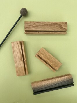 Dshamila Annina created the percussion instruments from the chestnut wood native to the places where she lives in Switzerland and Italy. Together, they tested the material for its sound qualities but also designed the objects to serve as an LP display for the living room. Dshamila shares her thoughts about the process: “Sound needs bodies to vibrate. The structure, size and space of and within a body create and influence its sound possibilities. The body of the tree is wood. The beauty of wood is that even when the tree is dead, the wood as a material lives on and moves and resonates. This inspired us to investigate the sound of wooden shapes and dimensions to create small percussion instruments. The result is a small, funny truth of nature: each of these instruments (even if some of them have the same dimensions and are grown from the same tree) vibrates differently from the others and has its own sound.”