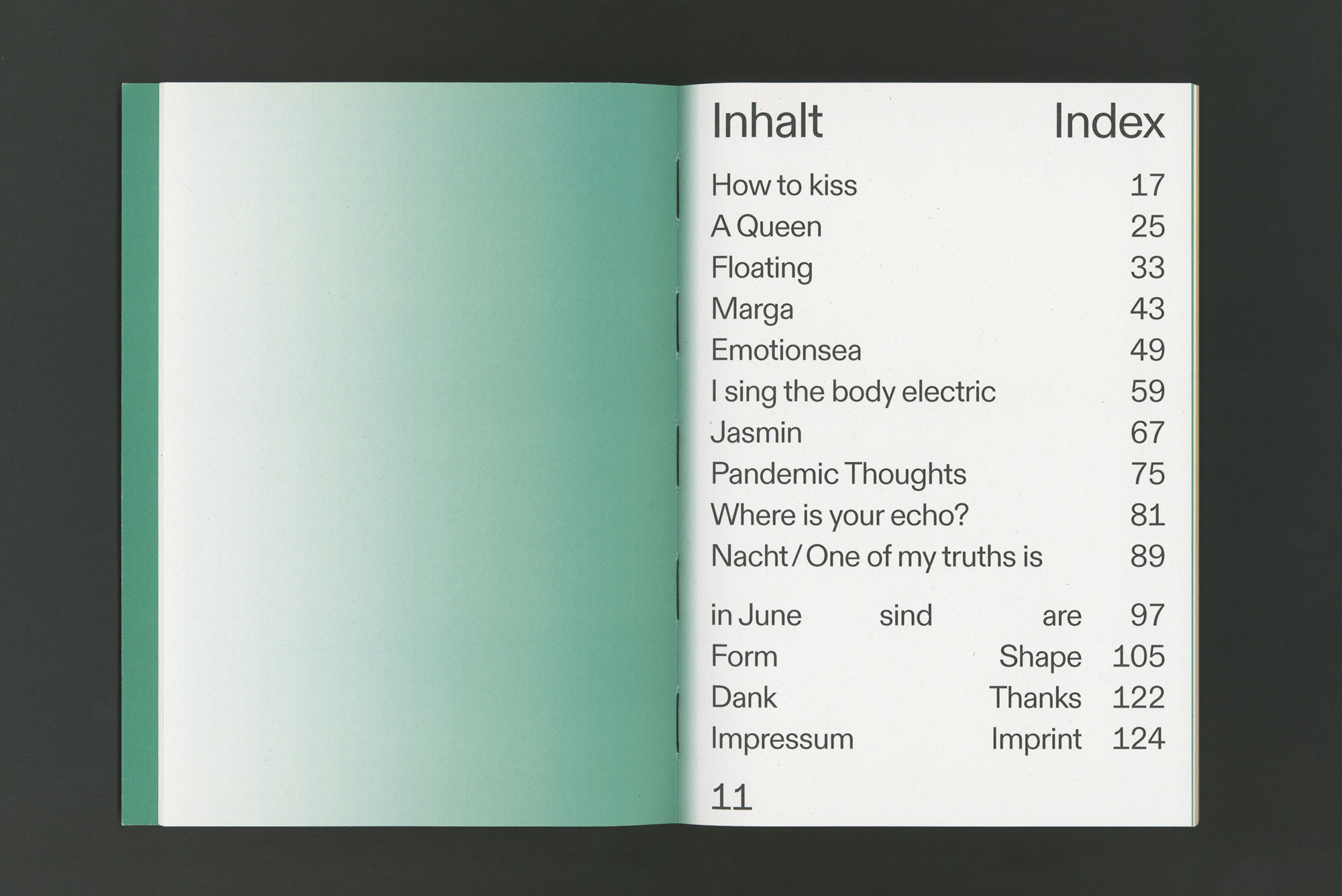 structures of contemporary pop songs – ranging from feather-light and playful to a soaring sea of roaring, agitated emotions. Last but not least, in June bridges (song) poetry and prose. The intended form of this album (in addition to the CD format and streaming of the album) is that of a bilingual, 120-page book. How does a song come to life, and where do those excerpts from the lyrics end up that didn’t make it into the recording? The texts in this book allow its readers to immerse in a world resting behind those songs.