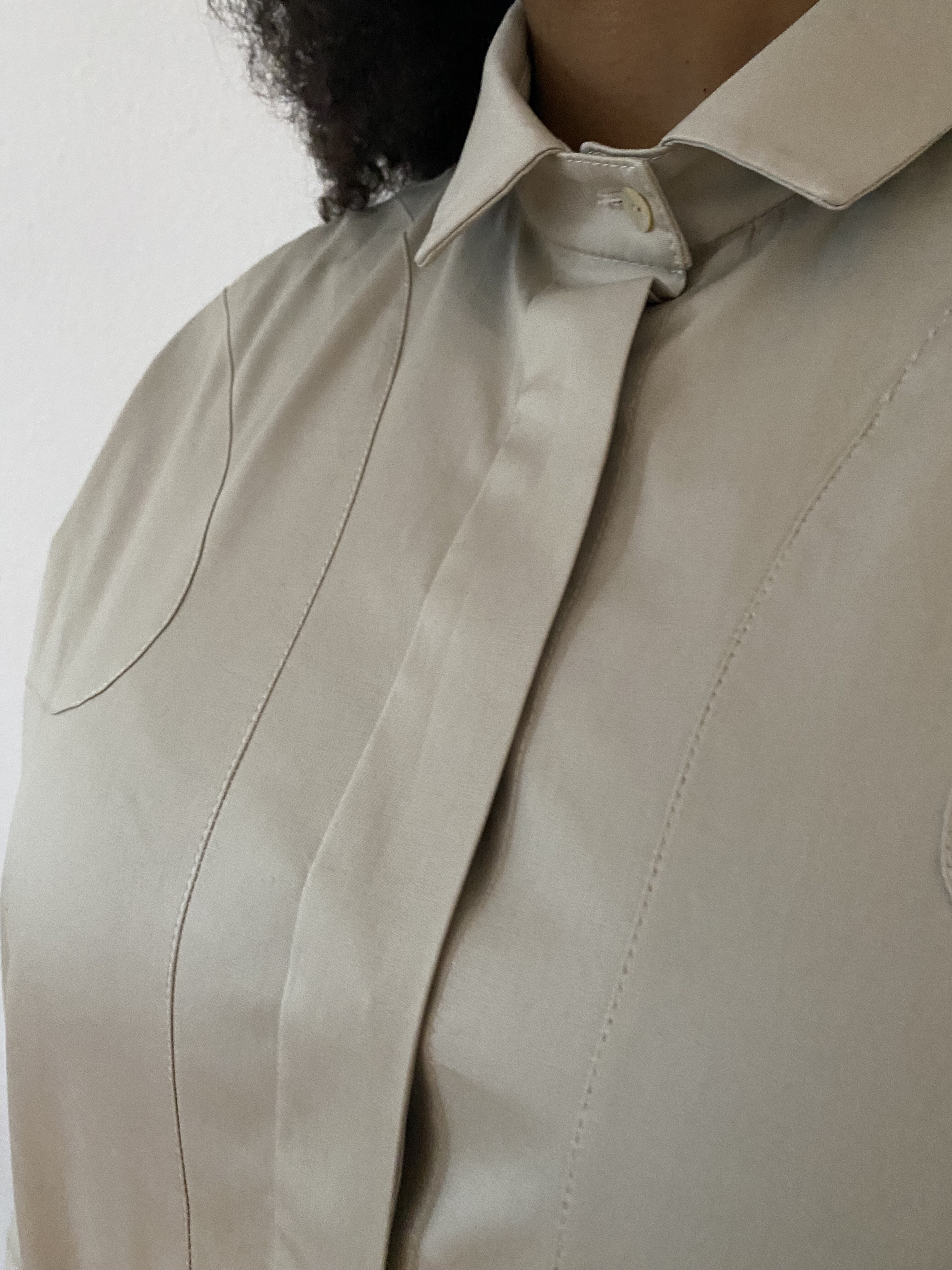 The corresponding creation by Katharina Haydeyan under the same title is a piece of clothing. A unisex shirt that combines strict cut of the garment with playfully curved, flowing lines that lend to it a light and modern look. The two available sizes are based Anna-Lucia and Fama. The blouse has a loose fit and invites the wearer to feel comfortable and free. Katharina explains the process of creation as follows: