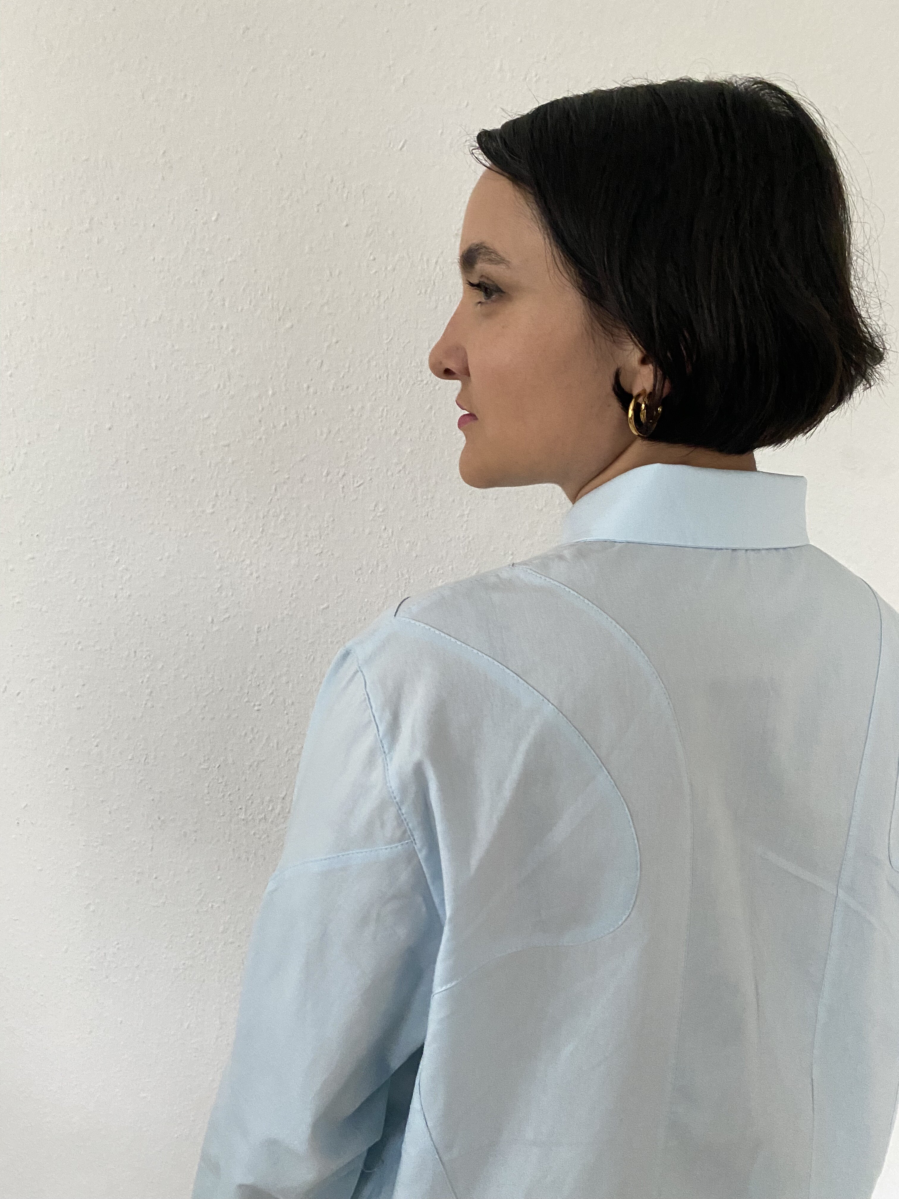 The corresponding creation by Katharina Haydeyan under the same title is a piece of clothing. A unisex shirt that combines strict cut of the garment with playfully curved, flowing lines that lend to it a light and modern look. The two available sizes are based Anna-Lucia and Fama. The blouse has a loose fit and invites the wearer to feel comfortable and free. Katharina explains the process of creation as follows: