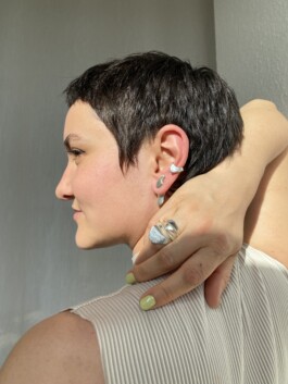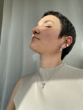 “Warrioress” is also the title of a collection of jewellery designed by Malene Glintborg in the process: a whole series of pieces that can be worn in combination with one another or individually. Multiple rings, stud earrings, ear cuffs, a necklace trinket. In conjunction, they create the impression of an armor. In the same way the songs unfolds by adding new elements layer by layer, loop by loop into “the dance of the warrioress”.